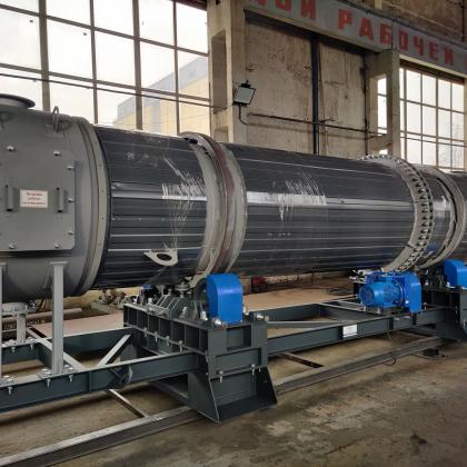 Конструктивно сушильный барабан состоит из корпуса, станции опорной и упорной, привода, бандажей, венца зубчатого с наклоном в сторону выгрузки материала.