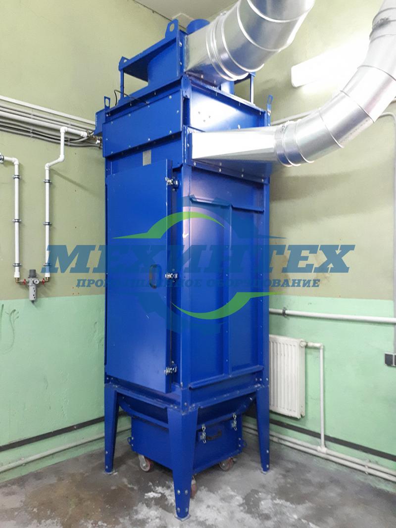 Загрязненный воздух поступает в рабочую камеру, расположенную в верхней части фильтра, с отбойной плитой и при этом крупные и тяжелые частицы пыли направляются непосредственно в бункер, снижая нагрузку на рукава, а оставшийся воздух проходит через фильтровальные элементы. При очистке частицы пыли задерживаются на наружной поверхности фильтровальных элементов, а очищенный воздух через выпускной патрубок отводится из картриджного фильтра.