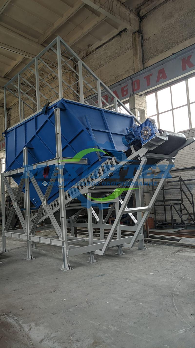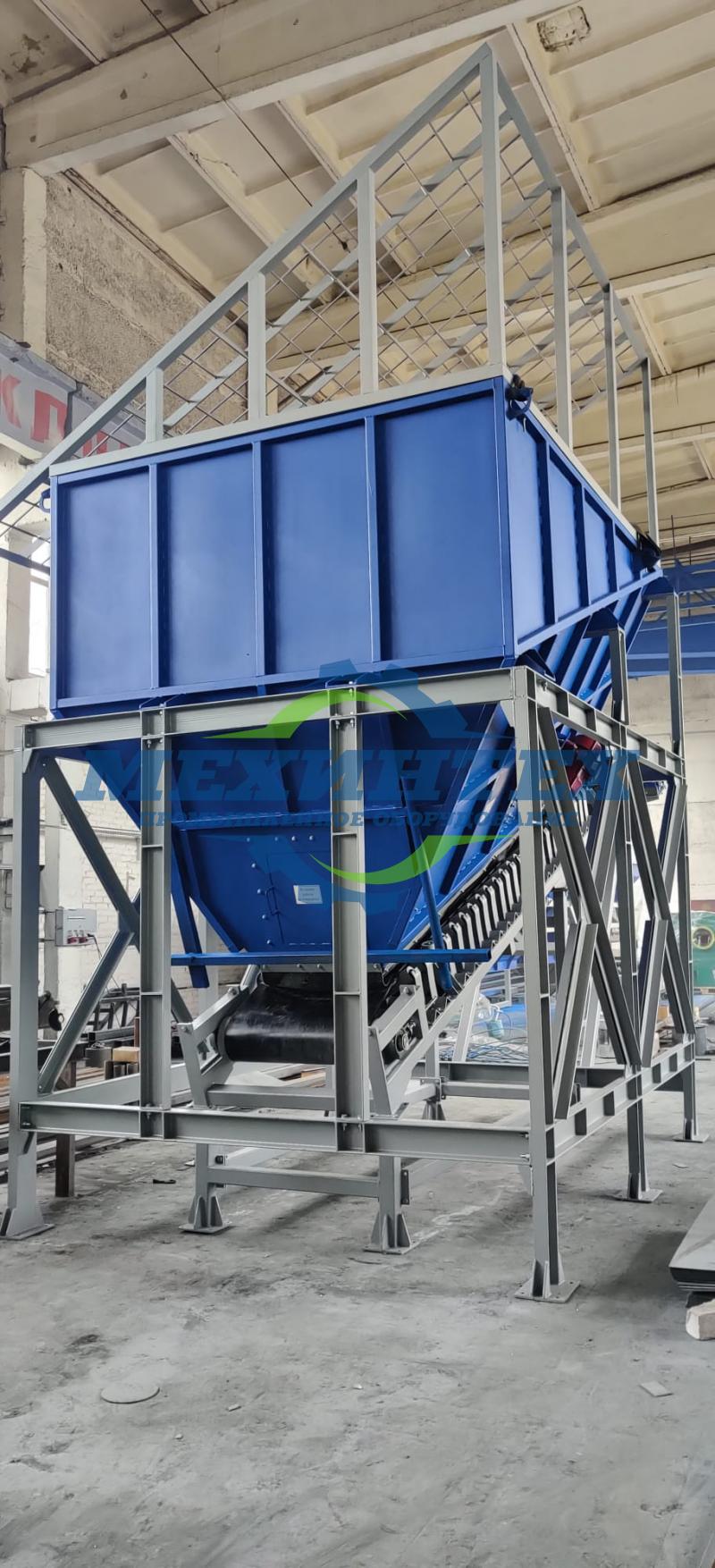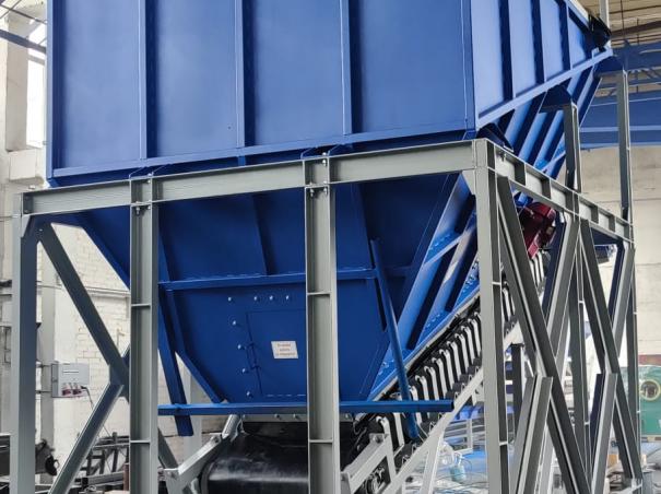 Питатель ленточный оснащен бункером 14 м3 на котором установлена решетка для удаления крупных курсовых отходом, а так же электровибраторами для предотвращение налипания сырья на стенки бункера. Подача сырья из бункера дальше по линии осуществляется с помощью ленточного желобчатого конвейера КЛЖН-800х5500-11.